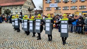 Als wandelnde Litfaßsäulen karikierten wir das im Jahr 2025 in Lindenberg aufgestellte Leitsystem 🙂